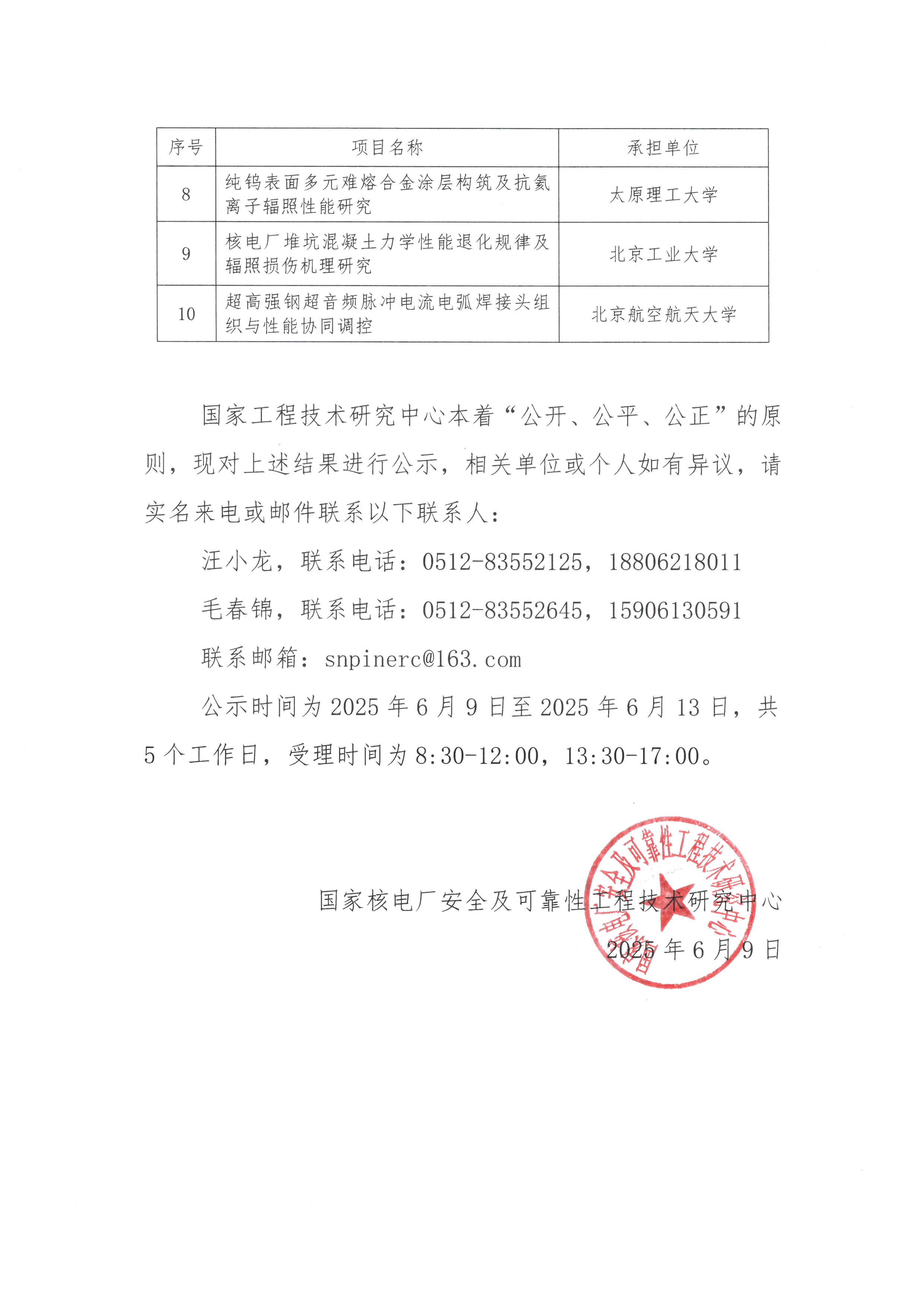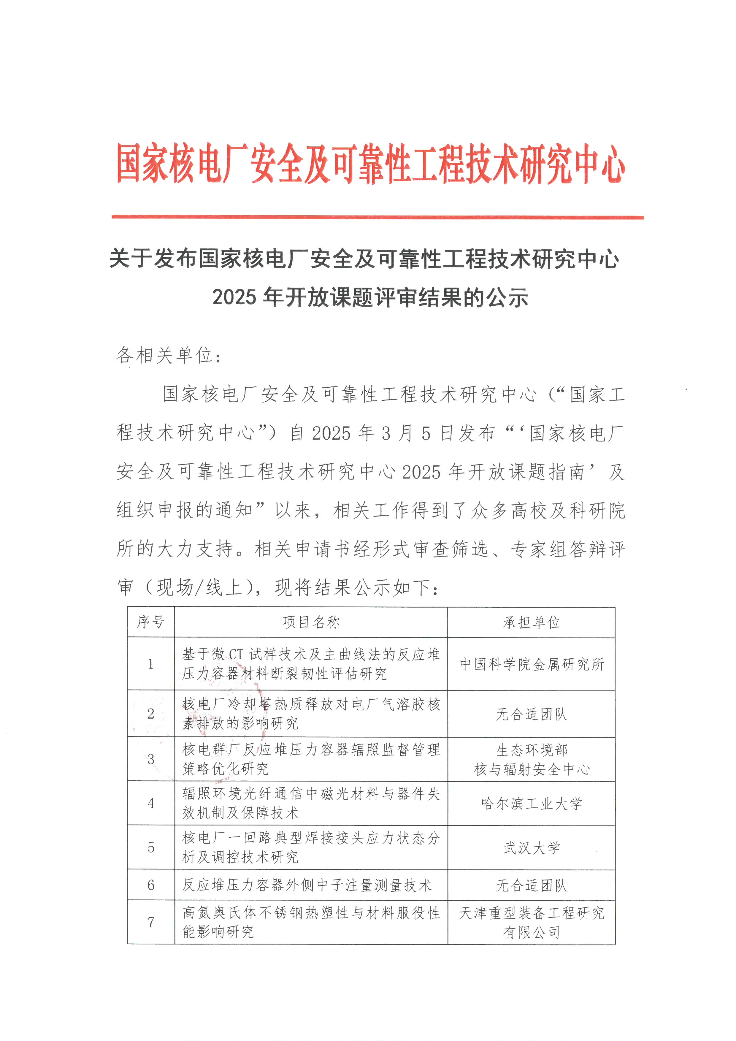 关于发布国家核电厂安全及可靠性工程技术研究中心2025年开放课题评审结果的公示