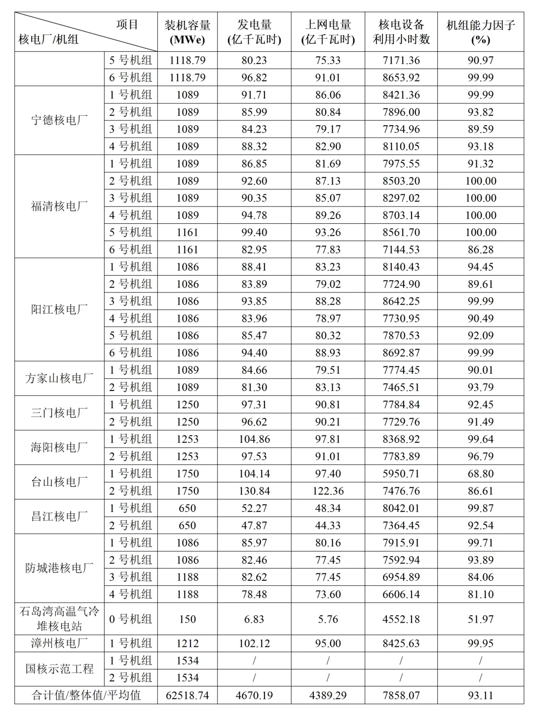 1)本表“合计值/整体值/平均值”中,装机容量、发电量、上网电量为各机组合计值,核电设备利用小时数为全部机组整体值,机组能力因子为全部参与统计机组的算数平均值。