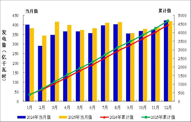 图2:2024年1月至2025年12月全国运行核电机组发电量趋势